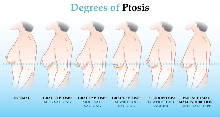The most important factors that determine the level of ptosis (breast sagging) include: The nipple position and the amount of breast tissue sagging below the crease. Anything beyond mild sagging (grade 1 Ptosis), will require a Breast Lift Technique. Higher grades will require a Reduction.