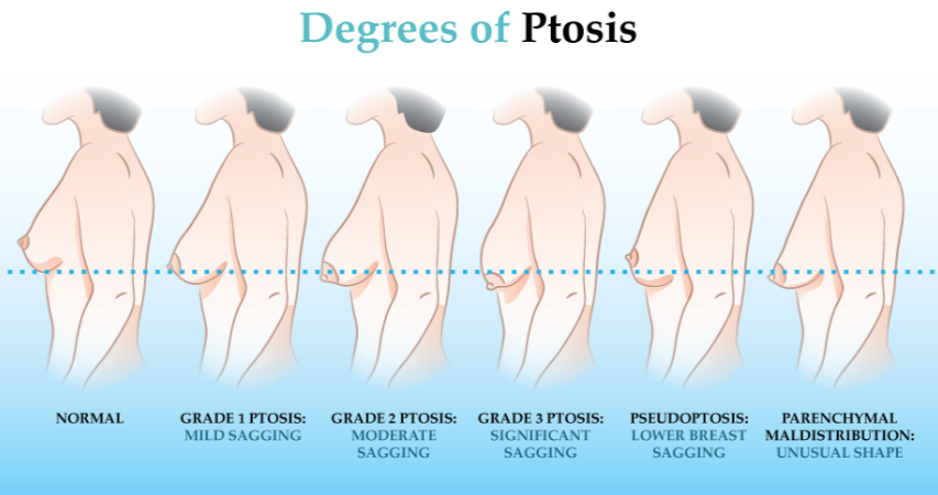 As you can see in the image below, there are various degrees of breast ptosis, most of which will require a lift technique. However, in some rare cases, breasts with mild ptosis (Grade 1 Ptosis in the image below) can be corrected with breast implants alone with the use of a Teardrop shaped implant!