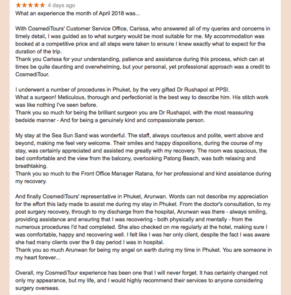 “Meticulous, thorough and perfectionist is the best way to describe Dr Rushapol, his stitch work is like nothing I’ve seen before!” – Tric, Gold Coast